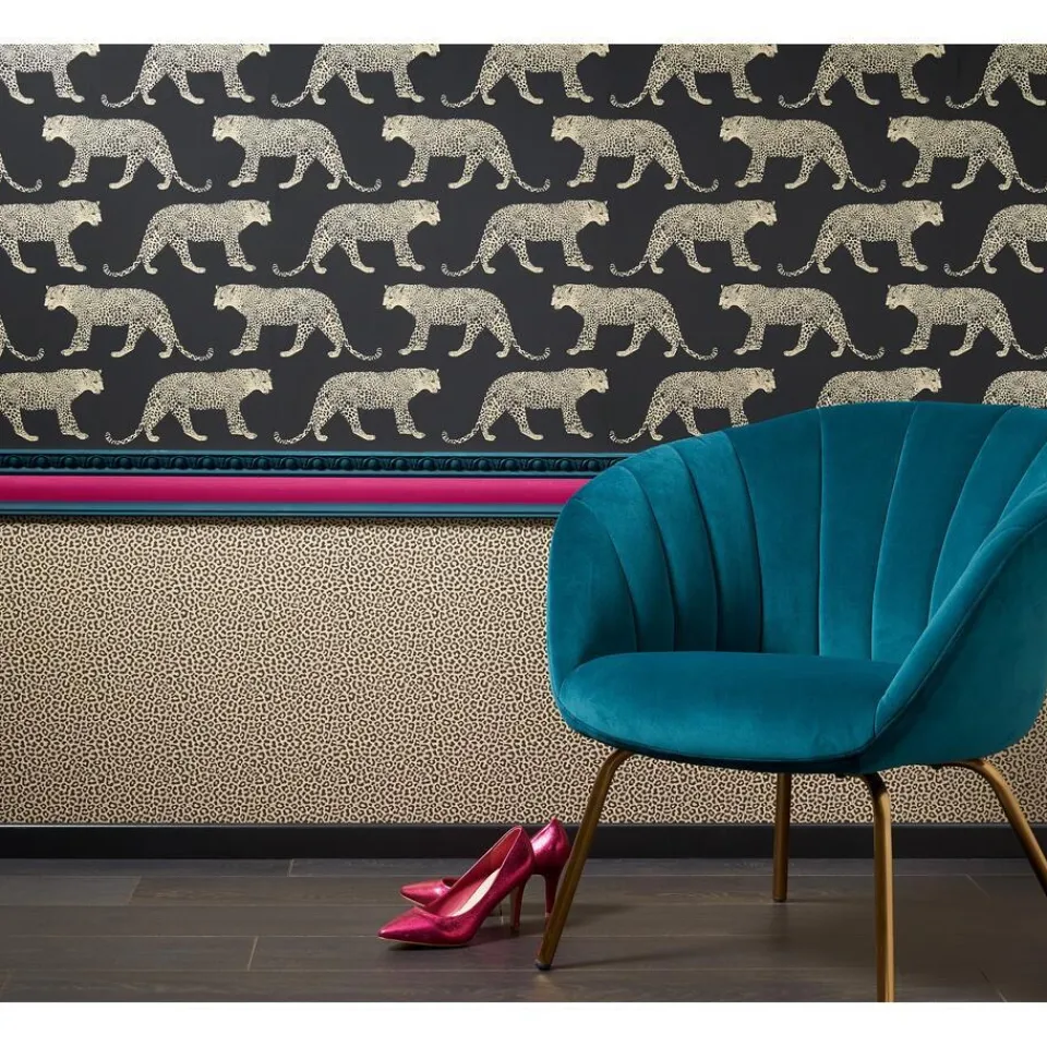 Vliesbehang zwart goud met panter motief. Licht afwasbaar. Voorzien van het FSC-keurmerk. Plakken met Perfax Roll-On. 10 meter per rol.