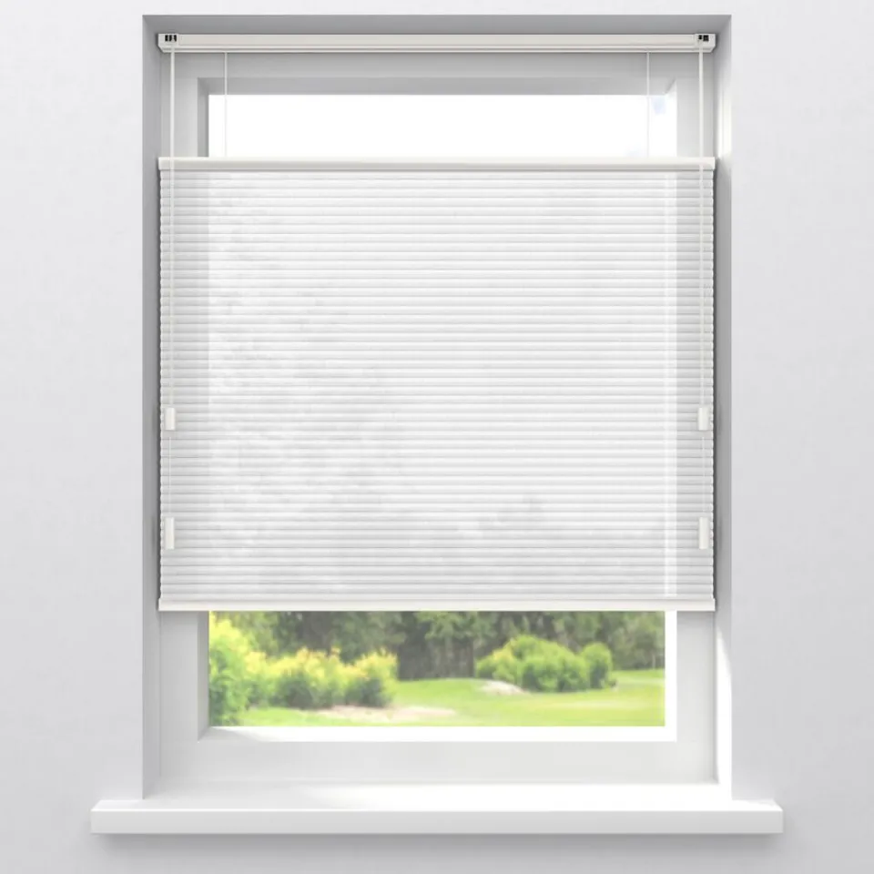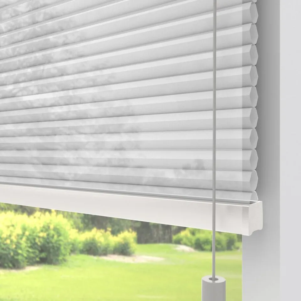 Lichtdoorlatende dubbel plissé van mat witte stof. De dubbel geplooide stof met een honingraatstructuur zorgt voor extra isolatie. De koorden zijn verwerkt in de honingraat en zijn niet zichtbaar. Verkrijgbaar als top down of top down bottom up. Bij een top down bottom up gordijn kan zowel de bovenkant als de onderkant worden uitgevouwen voor volledige controle over de gewenste lichtinval en privacy. Op maat te maken en standaard uitgevoerd met een wit aluminium systeem, bijpassende kunststof koordhanger en een universele wand- en plafondsteun.
