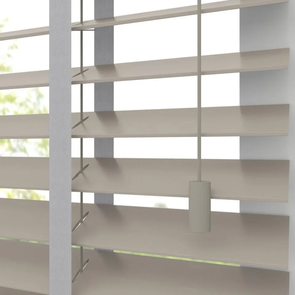 Houten jaloezie taupe met karakteristieke bamboe structuur en landelijke uitstraling. 100% bamboe. De brede lamellen van 50 mm zorgen voor veel lichtinval en bieden veel privacy wanneer je deze sluit. Op maat te maken en volledig naar wens samen te stellen. Bepaal zelf de bedieningszijde en kies uit diverse accessoires en uitvoeringen. Keuze uit een bijpassend ladderkoord, 48 verschillende ladderbanden en een koordhanger van hout, rvs of zwart metaal.