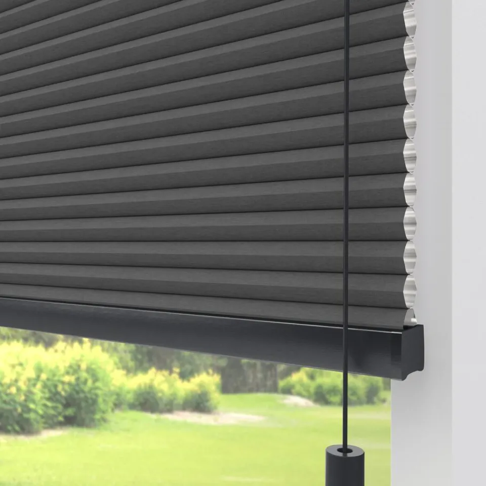 Verduisterende dubbele plissé antracietkleurig met witte achterzijde. De dubbel geplooide stof met een honingraatstructuur zorgt voor extra isolatie. De koorden zijn verwerkt in de honingraat en zijn niet zichtbaar. Verkrijgbaar als top down, top down bottom up of top down bottom up gespannen. Een top down bottom up gordijn kan zowel aan de bovenkant als de onderkant worden uitgevouwen voor volledige controle over de gewenste lichtinval en privacy. Een gespannen plissé is zeer geschikt voor draaikiepramen omdat de stof goed op zijn plek blijft. Op maat te maken en volledig naar wens samen te stellen. Bepaal zelf de kleur van het systeem en kies uit een bijpassende koordhanger van kunststof, rvs of zwart metaal.