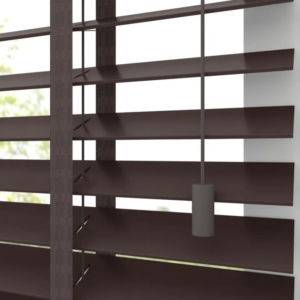 Houten jaloezie bruin met gelakte afwerking en lichte glans. 100% hout. De brede lamellen van 50 mm zorgen voor veel lichtinval en bieden veel privacy wanneer je deze sluit. Op maat te maken en volledig naar wens samen te stellen. Bepaal zelf de bedieningszijde en kies uit diverse accessoires en uitvoeringen. Keuze uit een bijpassend ladderkoord, 48 verschillende ladderbanden en een koordhanger van hout, rvs of zwart metaal.