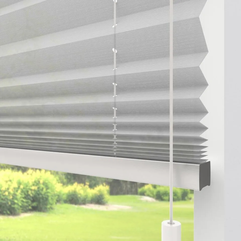 Transparante enkele plissé wit met structuur. Verkrijgbaar als top down, top down bottom up of top down bottom up gespannen. Een top down bottom up gordijn kan zowel aan de bovenkant als de onderkant worden uitgevouwen voor volledige controle over de gewenste lichtinval en privacy. Een gespannen plissé is zeer geschikt voor draaikiepramen omdat de stof goed op zijn plek blijft. Op maat te maken en volledig naar wens samen te stellen. Bepaal zelf de kleur van het systeem en kies uit een bijpassende koordhanger van kunststof, rvs of zwart metaal.