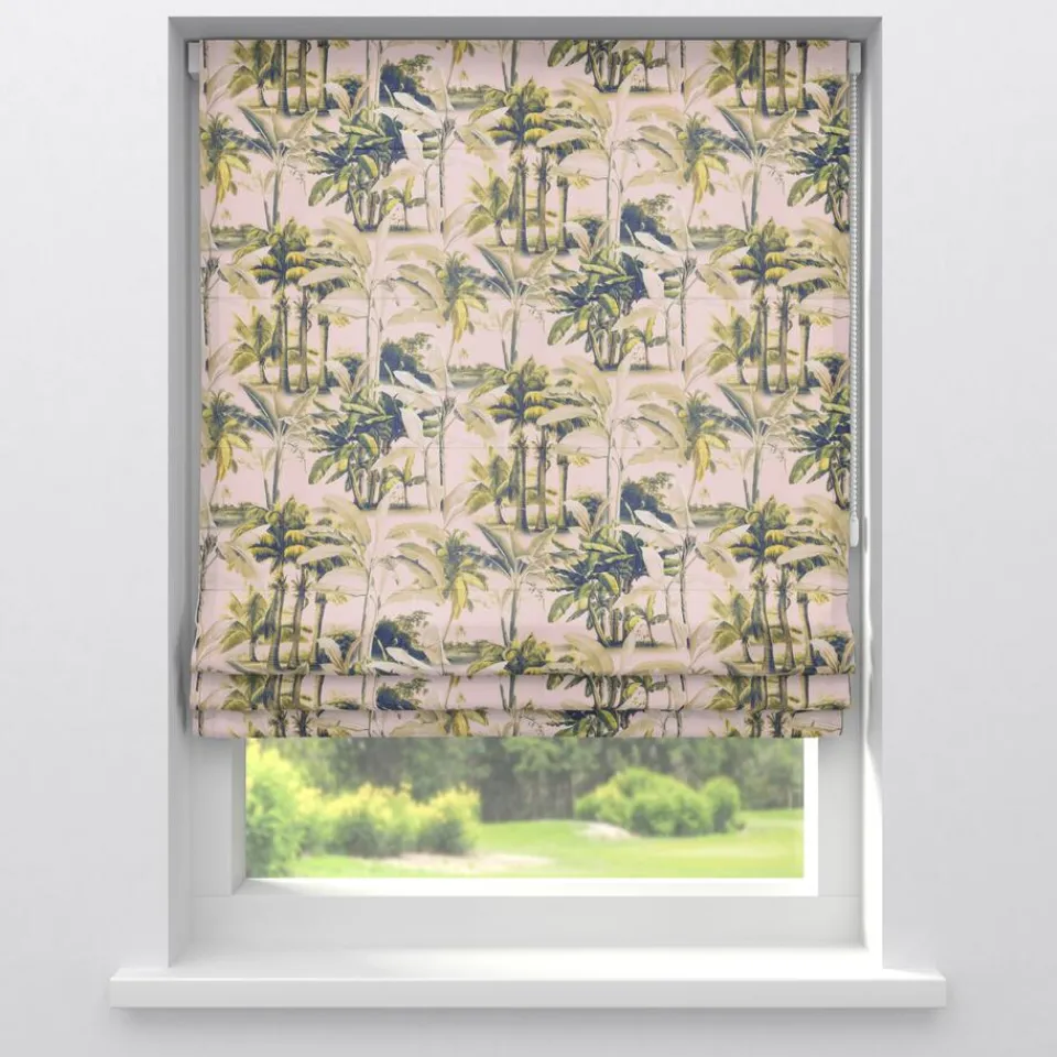 Lichtdoorlatende gordijnstof roze met botanische print. Soepelvallend, luchtig en stevig. Gemaakt van 100% katoen. 138 cm breed.