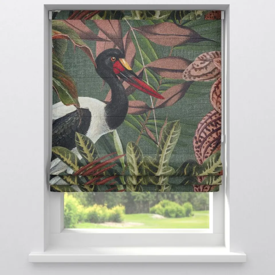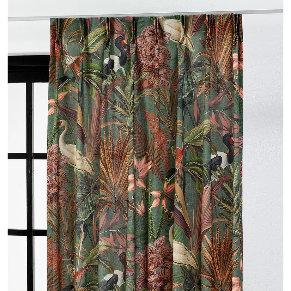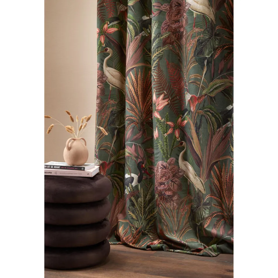 Gordijn Moniek in een groene kleur met een tropische print. Gemaakt van 100% katoen. 140 cm breed.