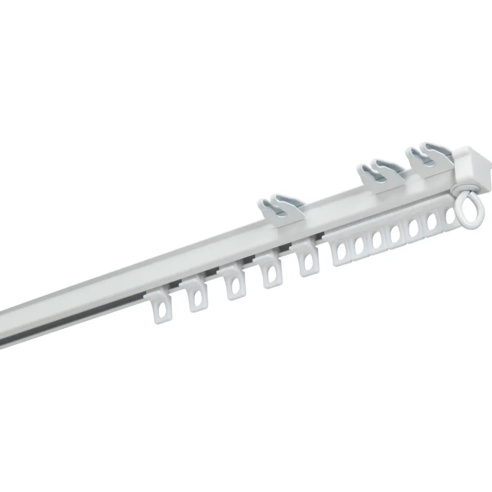 Gordijnrailset wit op maat 150 cm lang van aluminium. Complete set inclusief rails, eindstukjes, steunen en glijders. Plaats 1 steun om de 50 cm en 10 glijders per 100 cm. Rails aan de muur plaatsen? Gebruik afstandsteunen (20cm art.nr. 0484034 of 10cm ar
