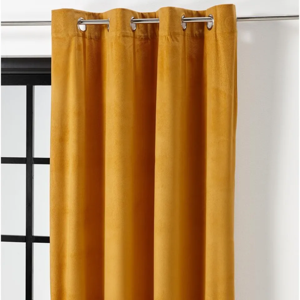 Kant en klaar ringgordijn van stevige okerkleurige stof. Soepelvallend en kreukherstellend. 135 cm breed.