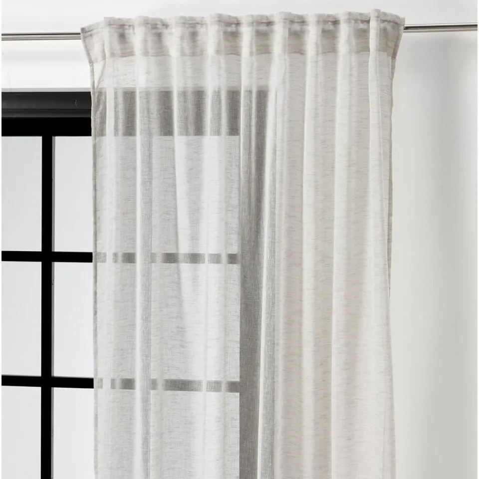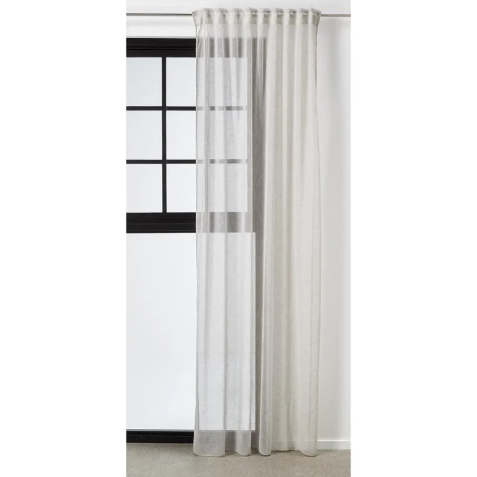 Kant en klaar gordijn van luchtige zandkleurige stof met plooiband en lussen. Soepelvallend en kreukherstellend. 135 cm breed.