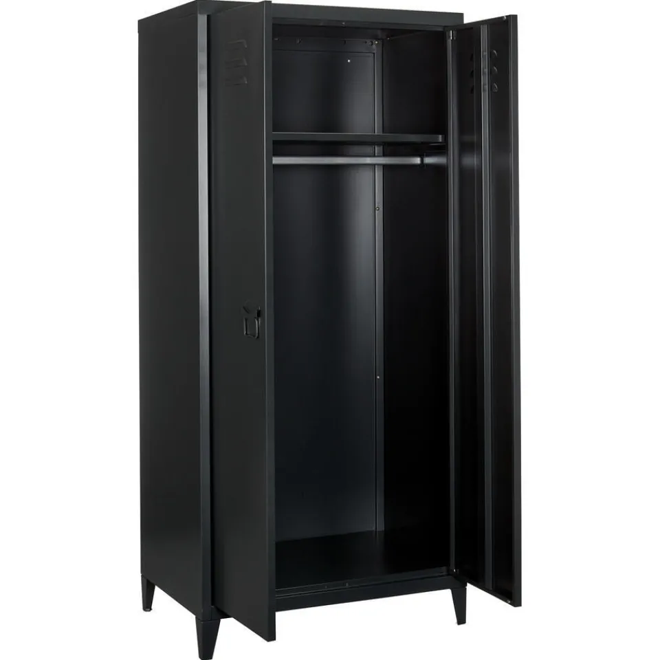 Stoere kledingkast van zwart metaal. Ziet er uit als een lockerkast. Met 2 deuren, een hanggedeelte en 1 legplank. 76x50x165 cm (lxbxh)