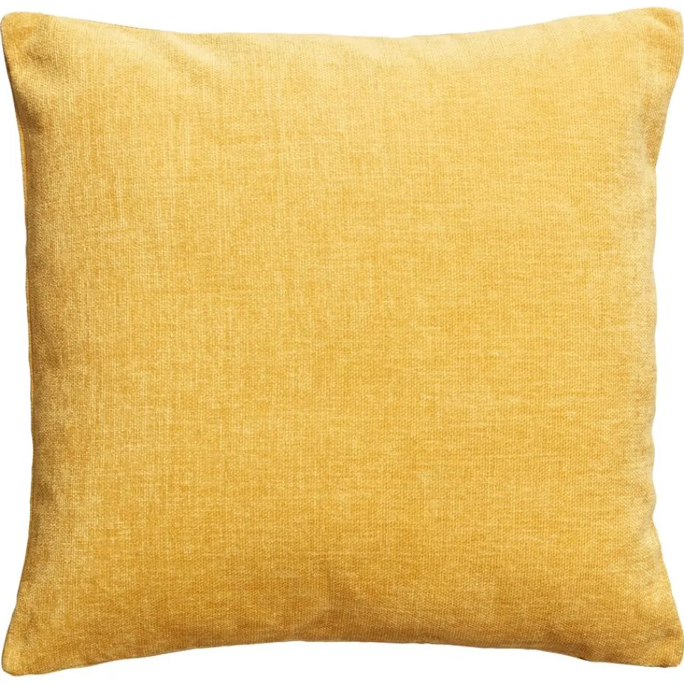 Modern kussen van zacht okerkleurige stof met velours look. 45×45 cm (lxb).