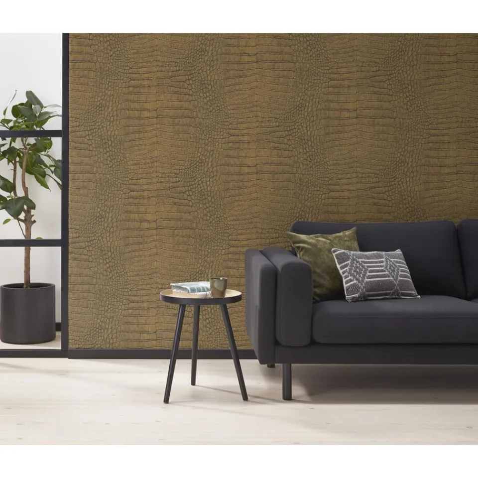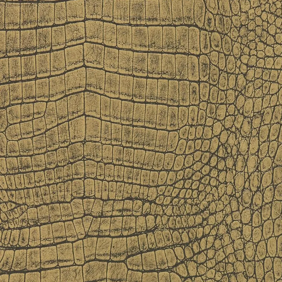Vliesbehang met goudkleurig alligator dessin en voelbare structuur. Goed afwasbaar. Voorzien van het FSC-keurmerk. Plakken met Perfax Roll-On. 10 meter per rol.