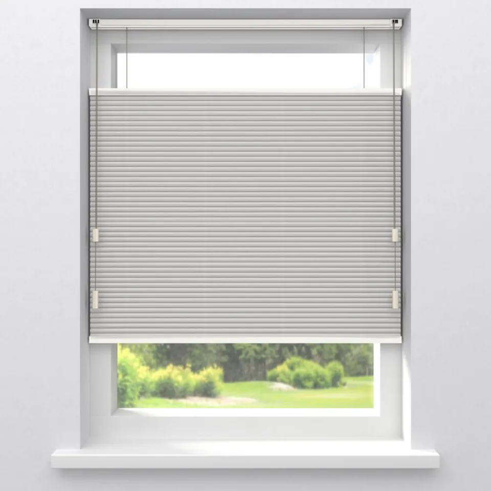 Verduisterende dubbele plissé lichtgrijs met fijne structuur en witte achterzijde. Dit mooie dubbele plissé gordijn heeft de hoogste isolatiewaarde. Het heeft een honingraatstructuur die een stilstaande luchtlaag creëert, dit zorgt voor een isolerende werking. Het zorgt ervoor dat de warmte binnen blijft als het buiten koud is en andersom. De aluminium coating aan de binnenzijde, levert de meeste energiebesparing op. Voor een isolerende werking kun je ook denken aan een combinatie tussen plisségordijnen en een overgordijn. De koorden zijn verwerkt in de honingraat en zijn niet zichtbaar. Verkrijgbaar als top down, top down bottom up of top down bottom up gespannen. Een top down bottom up gordijn kan zowel aan de bovenkant als de onderkant worden uitgevouwen voor volledige controle over de gewenste lichtinval en privacy. Een gespannen plissé is zeer geschikt voor draaikiepramen omdat de stof goed op zijn plek blijft. Op maat te maken en volledig naar wens samen te stellen. Bepaal zelf de kleur van het systeem en kies uit een bijpassende koordhanger van kunststof, rvs of zwart metaal.