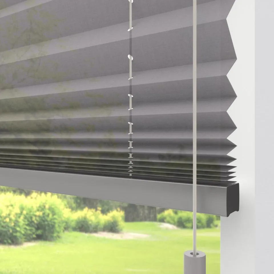 Lichtdoorlatende enkele plissé van grijze gemêleerde stof. Verkrijgbaar als top down, top down bottom up of top down bottom up gespannen. Een top down bottom up gordijn kan zowel aan de bovenkant als de onderkant worden uitgevouwen voor volledige controle over de gewenste lichtinval en privacy. Een gespannen plissé is zeer geschikt voor draaikiepramen omdat de stof goed op zijn plek blijft. Op maat te maken en volledig naar wens samen te stellen. Bepaal zelf de kleur van het systeem en kies uit een bijpassende koordhanger van kunststof, rvs of zwart metaal.