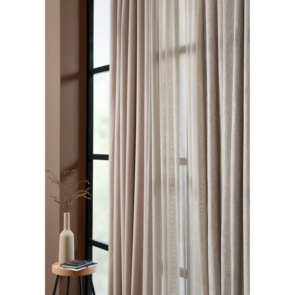 Soepelvallende zandkleurige gordijnstof. Stevig en kreukherstellend. 142 cm breed.