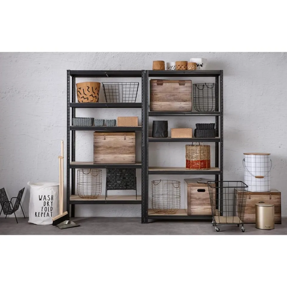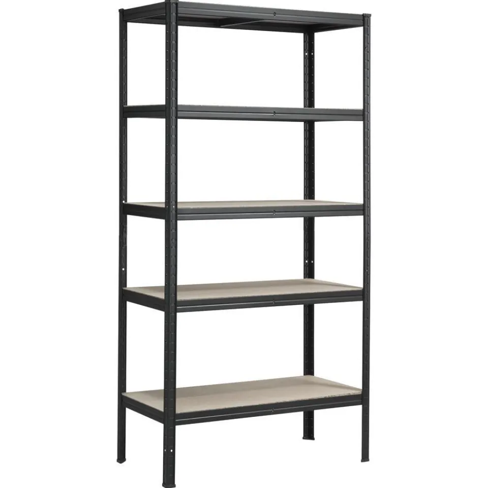 Opbergrek gemaakt van 100% metaal en MDF planken. Dit opbergrek heeft de kleur zwart. 90x45x180 centimeter. Het max. draagvermogen per plank is 175kg.