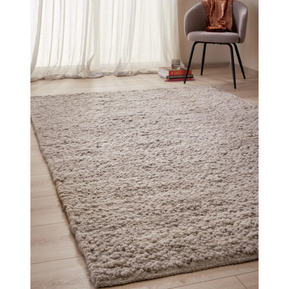 Handgemaakt bouclé vloerkleed van lichtgrijs gemêleerd wol. Veerkrachtig, geluiddempend en makkelijk in onderhoud. 160×230 cm (bxl).